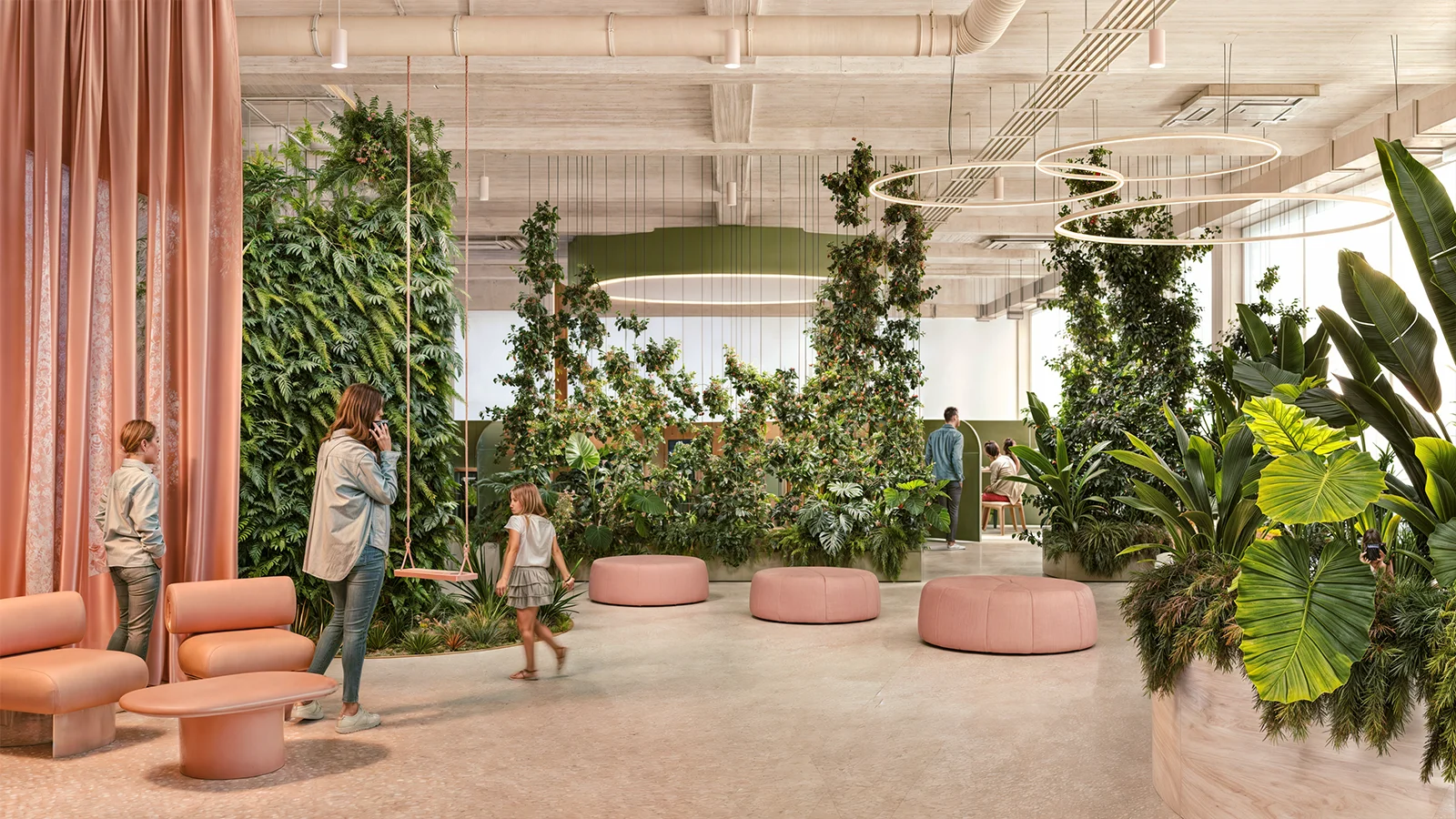 Dynamische Elemente: Einzigartige Design-Features wie Schaukeln, vertikale Begrünung (Green Walls) und modulare Wendeltreppen aus Stahl fördern die Kreativität und das Engagement der Mitarbeiter.